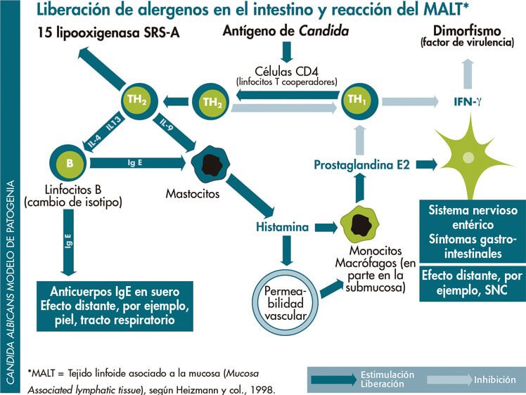 Con especial frecuencia se ha observado una asociación entre el sobrecrecimiento de Candida del tracto gastrointestinal y los procesos alérgicos [Palma-Carlos y col., 2002] o síntomas cutáneos (se ha discutido que algunas reacciones alérgicas cutáneas pueden ser causadas por antígenos de Candida, teniendo como fundamento procesos inmunológicos sobre los que puede influir Candida a través del GALT- tejido linfático asociado al intestino.