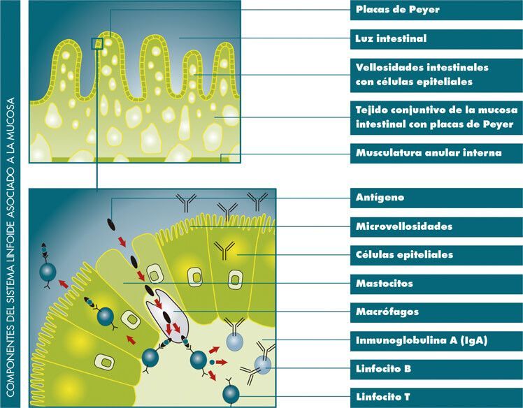 La mucosa del tracto gastrointestinal alberga el mayor arsenal de linfocitos del organismo. Ningún otro órgano es capaz de producir una cantidad tan grande de anticuerpos. Las cepas apatógenas E. coli y Enterococcus actúan como “compañeros” necesarios de estos linfocitos, para el correcto entrenamiento del sistema inmune. La microbiota inmunomoduladora, regula y modula el correcto funcionamiento de todos los componentes de la inmunidad celular y humoral a nivel local (Placas de Peyer, linfocitos intraepiteliales…), induciendo respuestas inmunitarias inespecíficas, manteniendo de esta forma un continuo entrenamiento del sistema inmunitario.