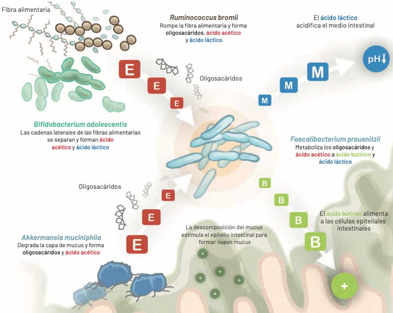 La microbiota sacarolítica primaria apoya la actividad de la microbiota muco- nutritiva al descomponer la estructura de los carbohidratos complejos. Al mismo tiempo, estimula otras especies bacterianas para la degradación de la fibra.